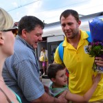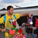 На вокзалі героя зустрічала родина, друзі, представники ЗМІ, Департаменту у справах молоді та спорту, а також керівництво Школи вищої спортивної майстерності. Заступник директора ШВСМ Сергій Приз привітав Дімітрія та його тренера і батька Юрія Тімченко з високим досягненням, та побажав успіхів і надалі.